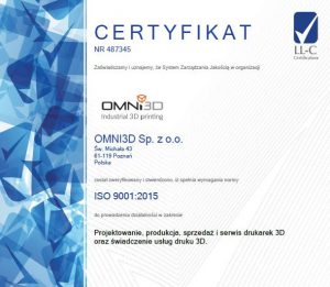 Our ISO certificate confirms the high quality of the 3D printers produced by Omni3D.