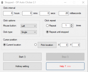 After opening the program, we can enter what time the click will be called. I suggest a value of 20 ms, which will cause 50 clicks per second. By selecting Hotkey setting, we can also select the key with which we will start and end the automatic click functions.